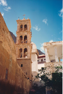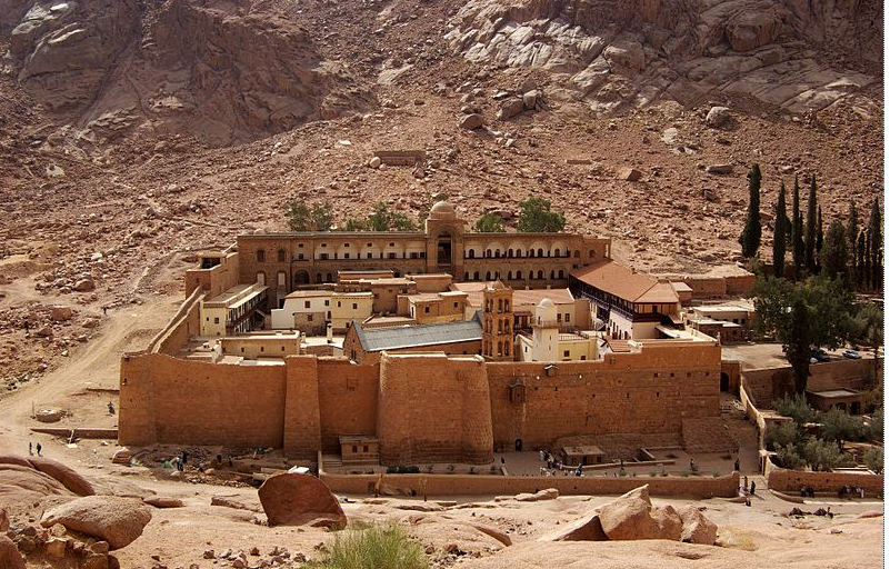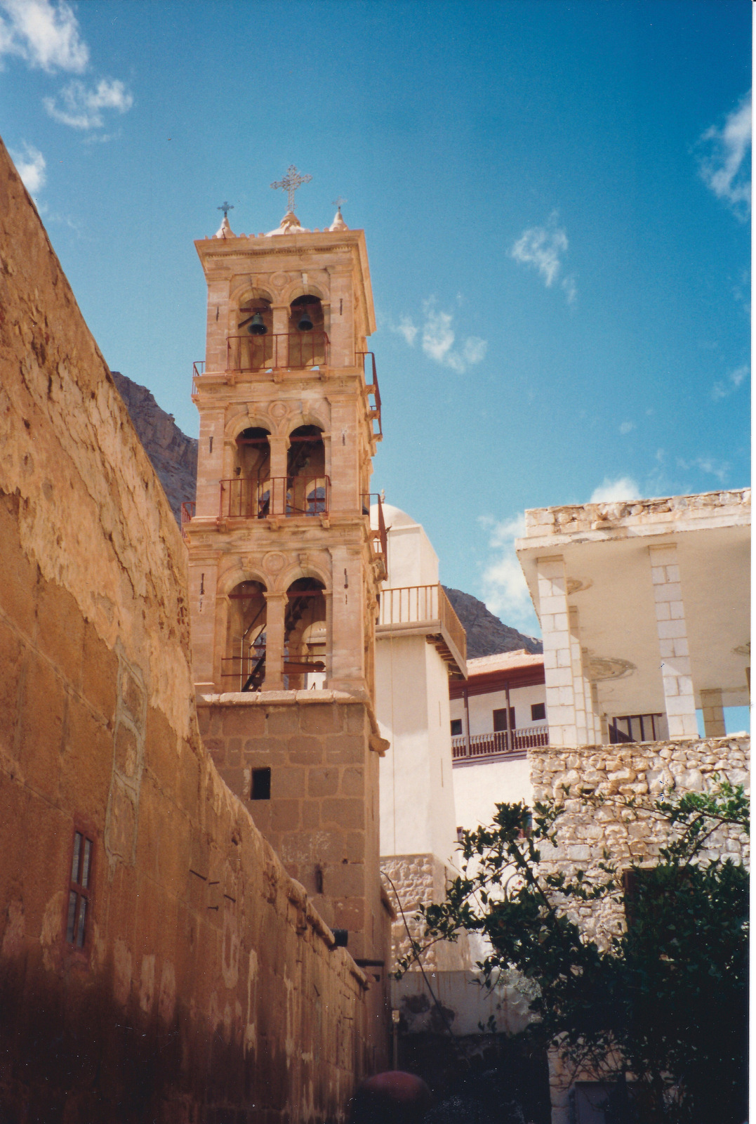 We crossed the barren desert to our goal, the ancient monastery of St. Catherine, founded in 325 by Constantine’s mother, St. Helena (who also found the True Cross in the church of the Holy Sepulcher). It was rebuilt in 548 by Justinian as a fortified monastery. An oasis set in the rocks at the foot of Mount of Moses, Jebel Musa, it was a place of peace, with Muslims and Greek Orthodox co-existing. One writer called the area “God-trodden,” and it seemed an apt description of the isolated area. The carved entrance doors made of Cedar of Lebanon have been used by uncounted pilgrims since the sixth century. Inside the grounds is a mosque for the Bedouins along with the famous flourishing green bush. It is said to be a cutting of the original taken from the site where Moses received the Ten Commandments, now the Chapel of the Burning Bush. It isn’t clear what species the Bush is. Some say it is a wild raspberry, others a rose or broom. When there is disagreement about a bush or a castle it is easy to picture all the other intractable disputes over other holy sites.