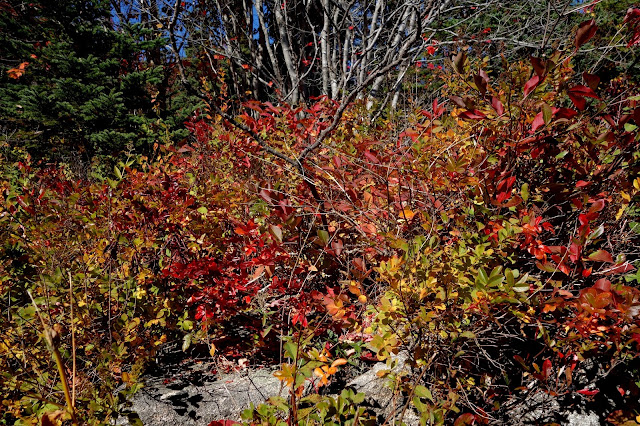 Dark Balsam fir and spruce contrasted with maples, birch, and ash, along with red-berried shrubs