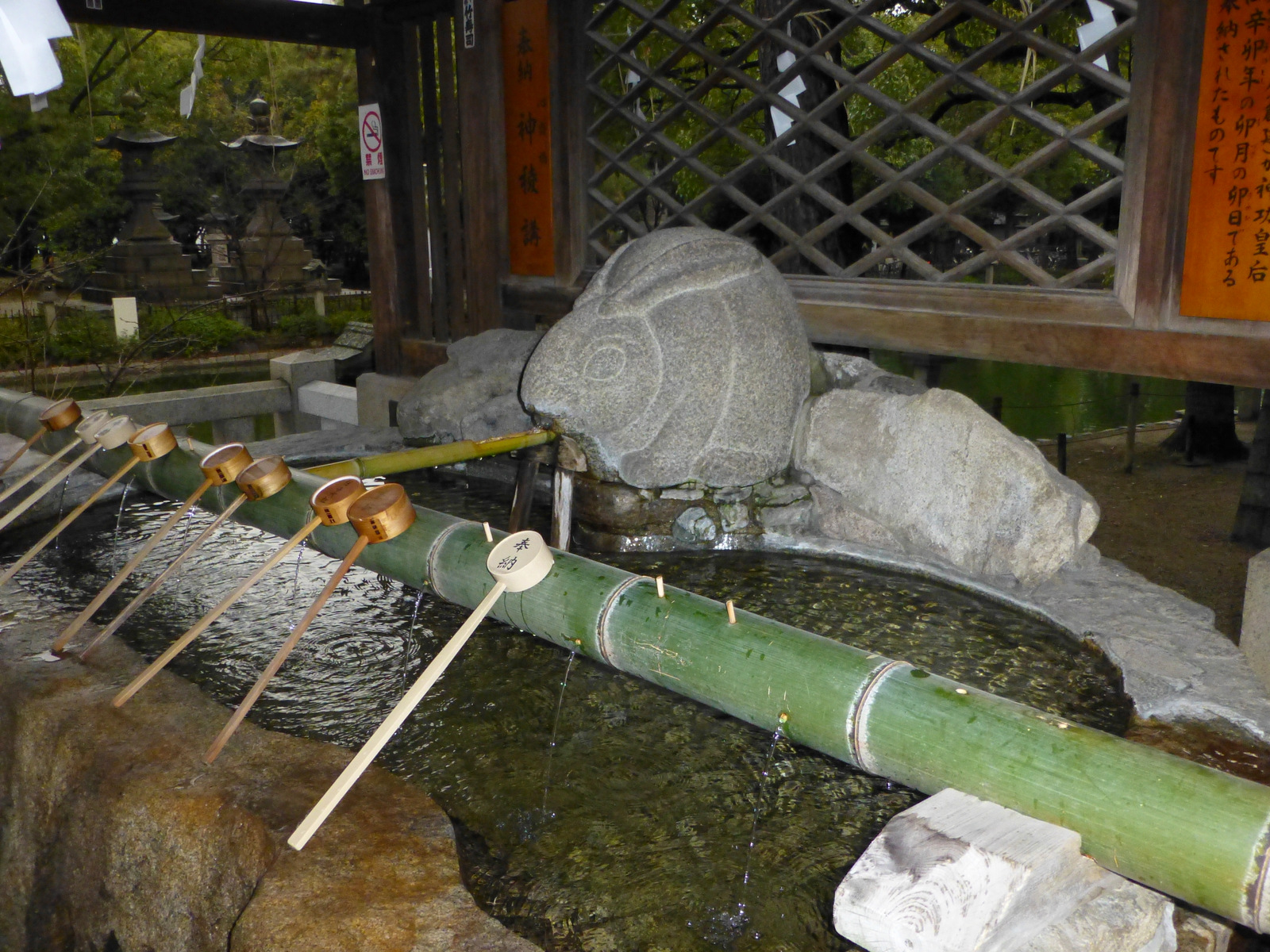 To enter the complex the visitor or worshipper passes by stone lanterns, through a tori gate marking the boundary between the everyday world and the infinite, and crosses the steep vermilion-painted Taiko-bashi bridge arching over a pond. The first stop is at the temizuya to wash hands and face for purification using a bamboo dipper for water collected in a basin supplied by a stone rabbit. Just outside the second tori gate ancient cypress trees are hung with shimenwa,ropes made of rice straw decorated with white paper streamers marking sacred areas.
