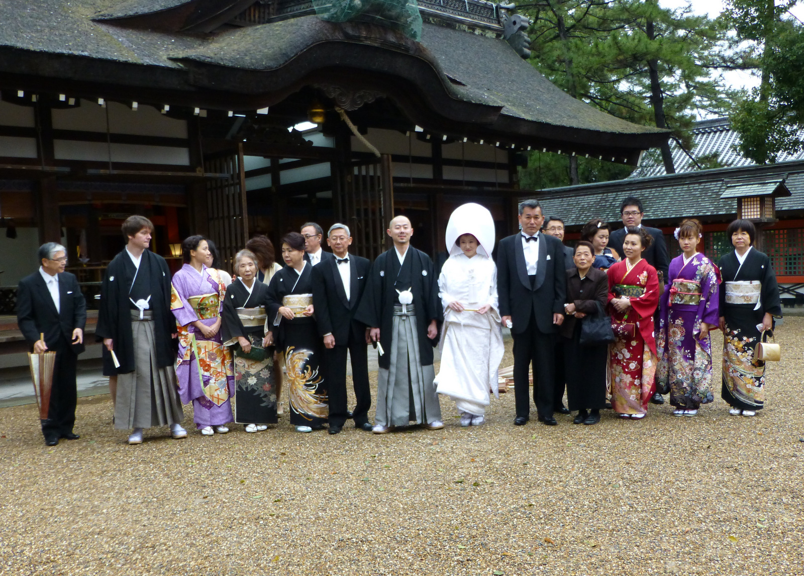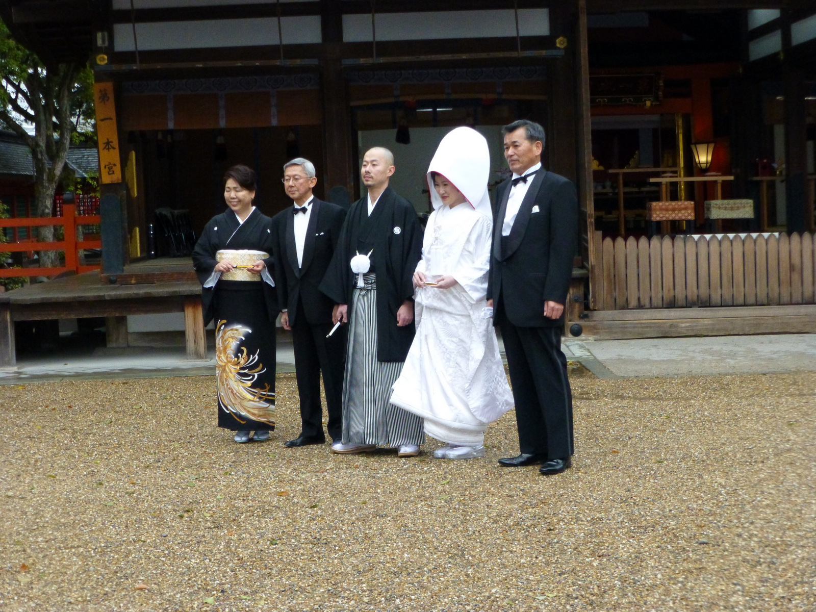 After the union was solemnized in what seemed to be a stately and timeless ceremony the couple and their family moved to the courtyard for photos and congratulations. The beautiful bride was swathed in a white satin kimono with a hood while the groom wore a tuxedo. Two of the other men were elegant in formal samurai dress complete with fans. It was a picturesque combination of ancient and modern.