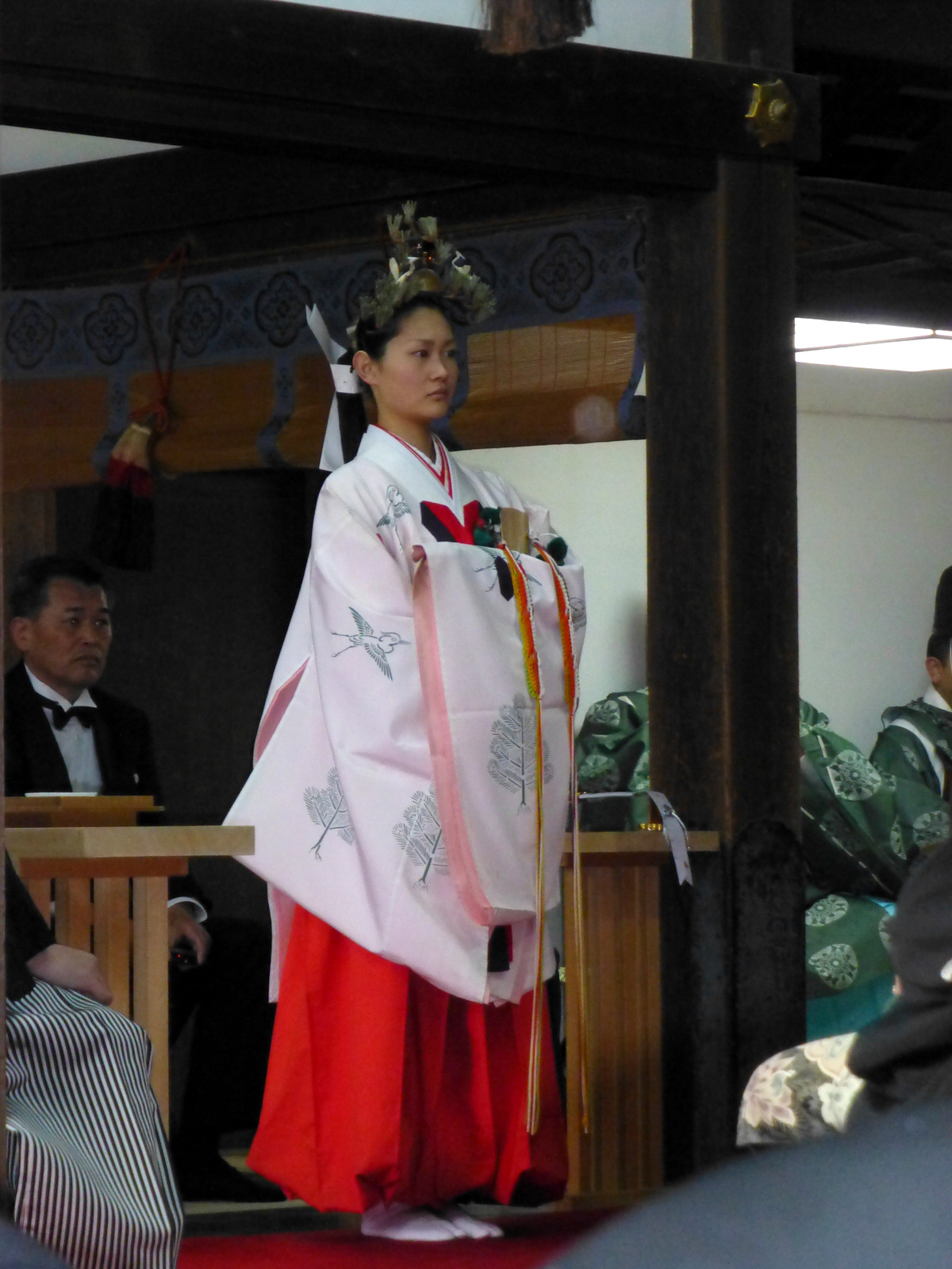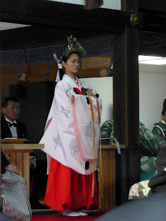 I could hear the sound of a drum and flutes playing what sounded to me mournful and tuneless music while two priestesses with headresses of pine and what looked like cranes moved in a slow ritual dance accompanied by musicians in green robes. The white-robed, black-hatted priest intoned words of a marriage rite. The bride and groom had their backs to us of course but through an open side door I could see a few family members sitting on the benches on each side watching the formalities.