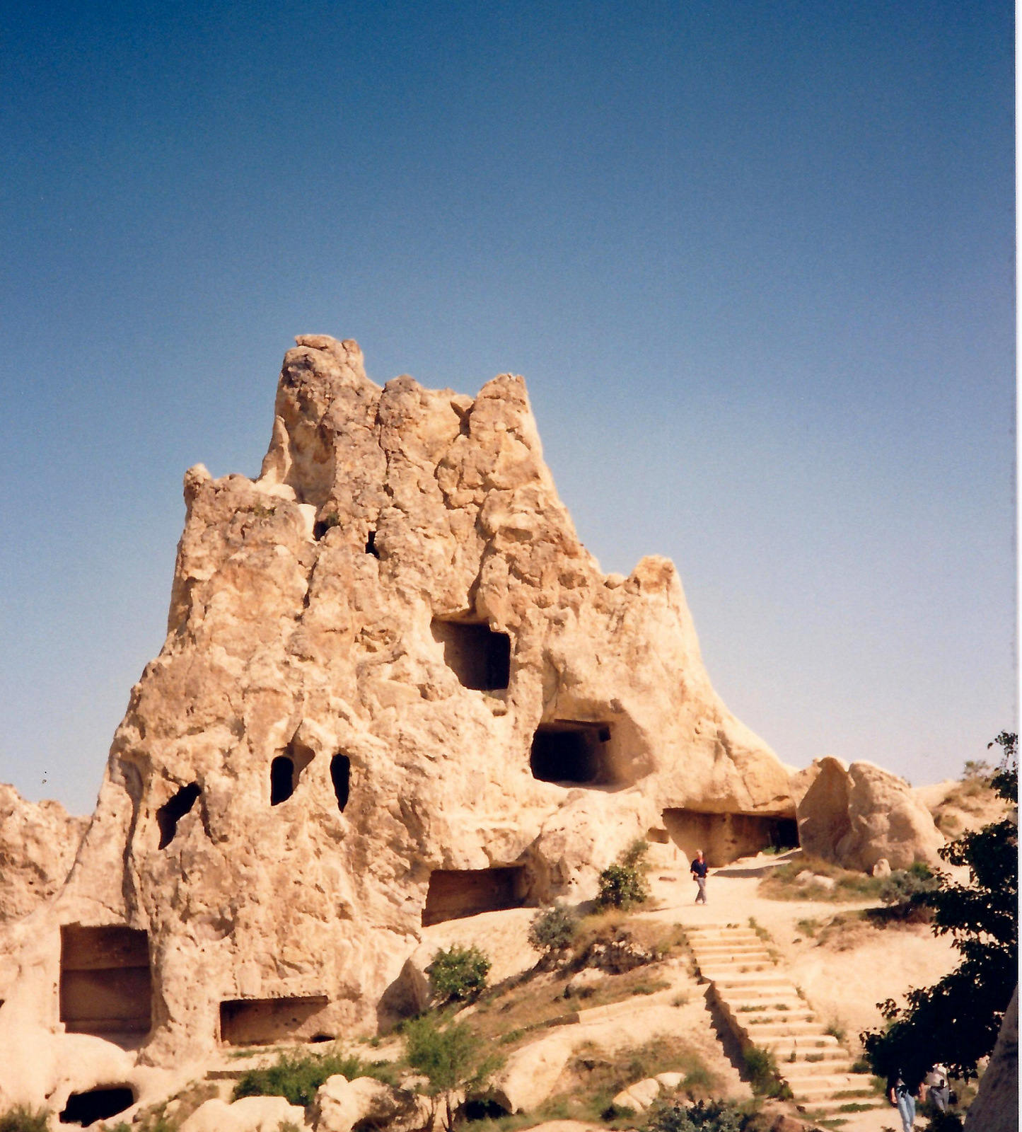 Cappadocia was like an ancient Disneyland with strange rock spires, rock-carved churches where the sides had fallen away leaving the 9th and 10th century Byzantine frescoes open to the elements, and luxury hotels set among and even within the soft rocks. Some of the tall rocks, called fairy chimneys, were topped with what looked like a boulder, making them look somewhat obscene. We entered one of the underground cities, this one eight stories deep; some are said to have eighteen stories sheltering up to 20,000 households from pagans in the troubled times when the Roman Empire was collapsing. How they and their animals could have survived such conditions was incomprehensible. The layers  of caves and air shafts remain monuments to an indomitable will to live despite the odds.