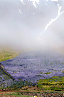 When it was time to return to Isafjordur we were treated to a mystical sight: Hovering above an immense field of lupine was a wisp of cloud. Above the moisture a mountain peak with its ice presided over the scene as if we were in Shangri-La.