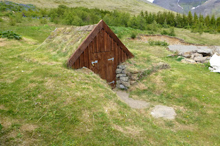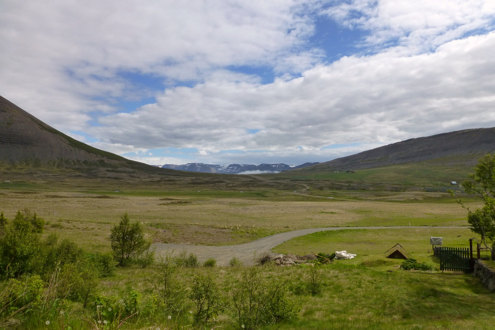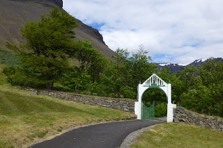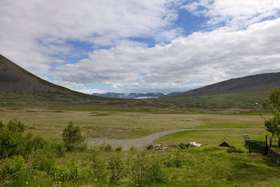 A small chapel and a collection of buildings, now used for a simple hotel and for live-in language courses, marked Nupur. Skrudur, a few minutes farther along, rests between the narrow Dyrafjordur fjord and a treeless plain at the base of ice-capped mountains. If we would have headed out the fjord toward the open sea we would have reached Greenland, a cold thought on a warm day.
