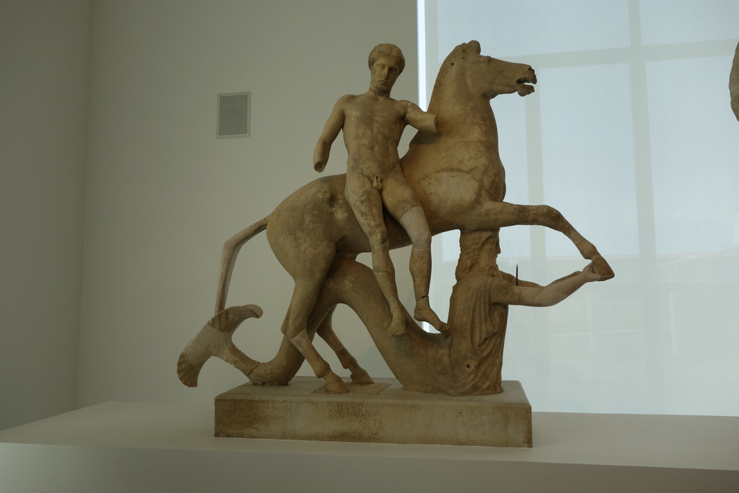 The museum, empty though it is, was more than worth the journey. The two Greek bronzes were found by chance in 1972 when a snorkeler noticed an arm sticking out of the sand. Not some poor drowned soul but a statue. The second one turned up nearby. They are an astounding example of workmanship. Most likely cast around 450 BC, the larger than life-size figures probably represent two warriors, one a young hero or god conscious of his own beauty and power, and an older more mature hero with a relaxed pose.