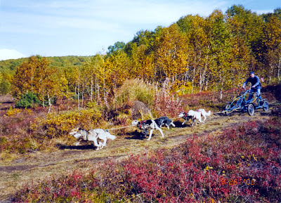 We could hear the dogs barking frantically, so agitated that they were jumping straight up until their chains jerked them back to the ground; they knew what was next on the agenda. Lunchtime over, the trainer brought out a sled with wheels for off-season use. As he held up the harness each dog seemed to be yelling “Take me, take me.”  He picked six dogs who rushed to the sled to be set in the traces. The trainer stepped on the back and off they went, so fast that we could hardly take a photo. The wheels of the sled bounced off the ground threatening to throw the driver into the dirt of the rough track. Back and forth, around and around the track the dogs ran with joy, their mates still at the kennel barking encouragement and longing for snow, not far away on this late September day.