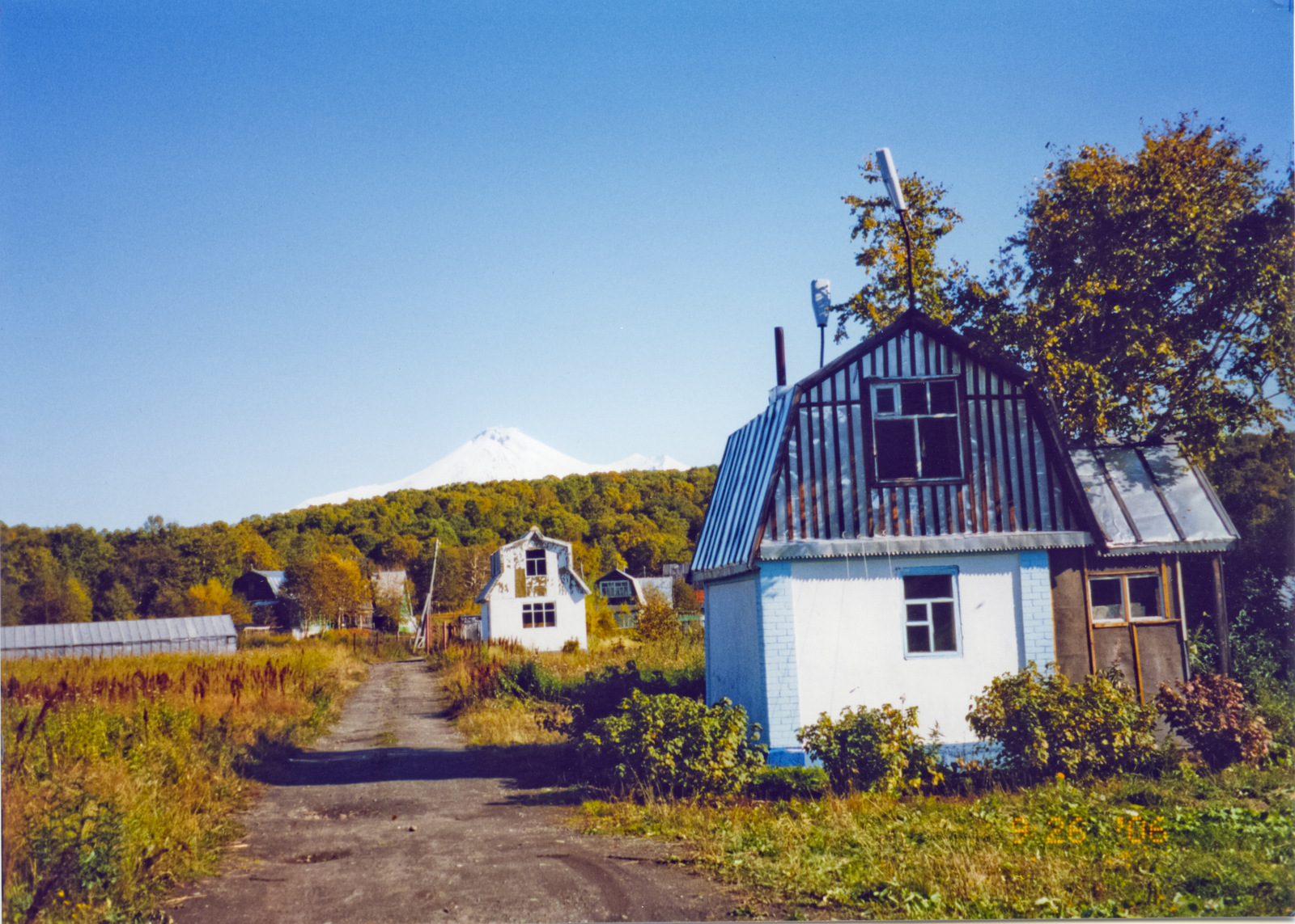 We climbed in a van, passed the inevitable statue of Lenin, gazing with determination toward who knows what now, and headed out of town, passing under steam-heating pipes arching the streets. It wasn’t long before we were in the countryside where birch trees and shrubs wearing fall bronze and gold leaves covered the hills. Turning off the road we traveled toward a sled dog training center, our goal for the day. A chorus of frantically barking dogs announced our arrival at a tiny cluster of buildings – the kennel, lodge and outbuildings and a few dachas surrounded with gardens of cabbages. Guarding the sight was one of the snowy volcanoes. The air was so still that its smoke plume looked like a white feather stuck on top for decoration before it dissipated.