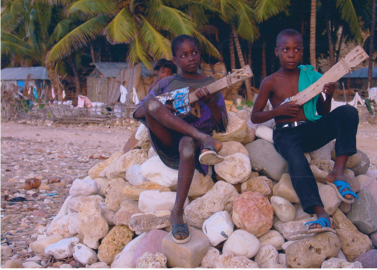 The third, two boys dressed in rags sitting on a pile of rocks in front of hovels with corrugated tin roofs shaded by palm trees. They are pretending to play guitars, each made of a board, two pegs and two strings. Whatever music was made, they represent an indomitable will to survive in that often sad place. I pray that they are still alive.