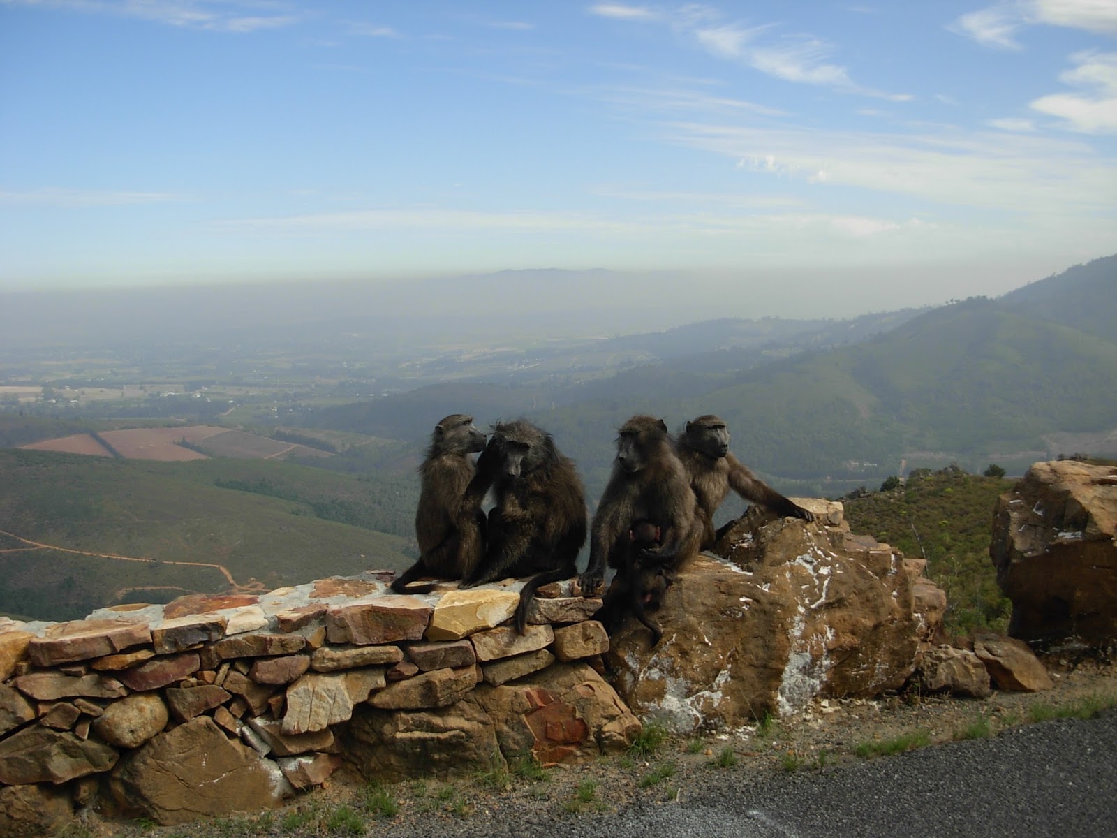We took a different route than the outgoing trip, this time over craggy and mostly barren steep hills. Proteus, the national flower of South Africa, bloomed in crevices. At the summit we came upon a troop of baboons, dangerous to people and destructive to crops, preventing us from getting out of the SUV to enjoy the view. We descended and reached Ceres again where a long line of angry-looking agricultural workers marched along the roadway holding signs, some in Afrikaans and others in English. Low wages and not enough work – the universal problem.