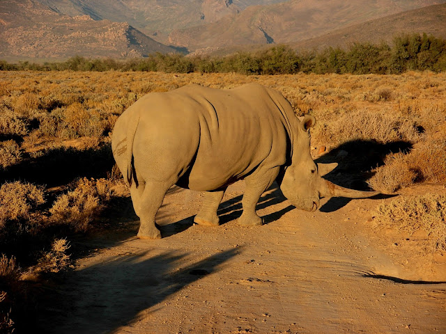 Rhinos and Cape buffalo, looking oblivious to our “ohs” and “aws” strolled to a waterhole, zebras cavorted, and giraffes trotted by with their rocking gaits. The low light cast a golden glow over the scene.