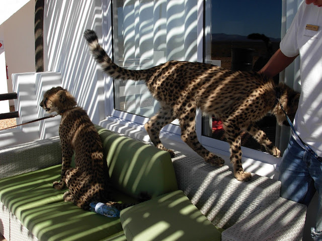 Not long after checking in we were greeted by two cheetah cubs (on leashes) coming to visit our bungalow. They were like large kittens rubbing against us, purring with a deep rumble. We petted the coarse fur and wondering what they were thinking, hoping that it wasn’t about dinner even though we’re pretty stringy. Their handler played with them but that ended when he put his fingers too close to one cub’s mouth and found his hand trapped. Another young man coaxed the animal to open up. No damage done but as my mother said, “Keep your hands to yourself.”