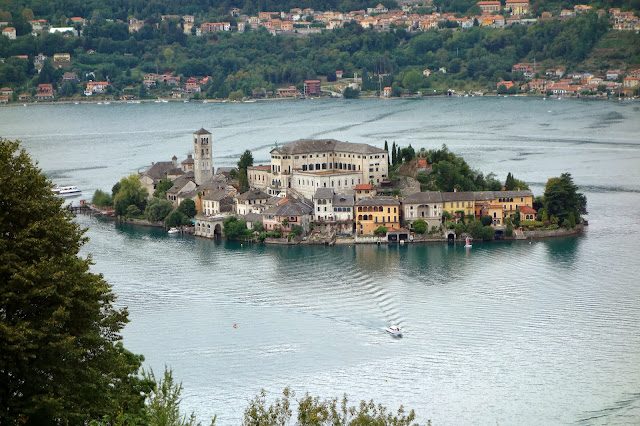 Mellow sunshine made the trees dressed in fall finery glow in the warmth of the day. We were off on a day trip from Milan through rolling forested hills to Orta San Giulio. The small town rests on the shore of Lago di Orta, one of the smallest of the lakes that decorate the northern part of Italy between the plain of the Po River and the Alps. This area has long been our romantic destination, both in actuality and in my mind.
