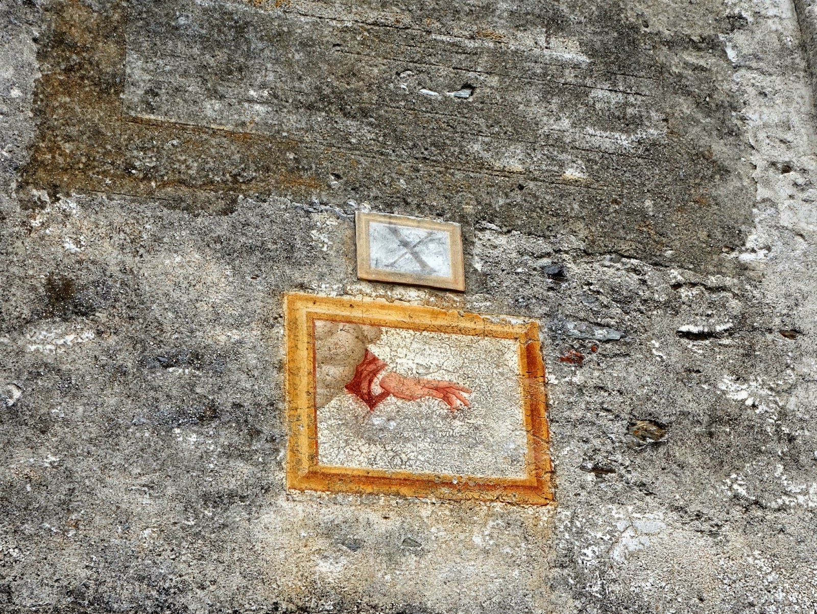 But it is the fresco on the exterior of every chapel that always attracts me: who can resist a a faded disembodied hand emerging from a cloud? Are they the hand of God admonishing the worshipper?