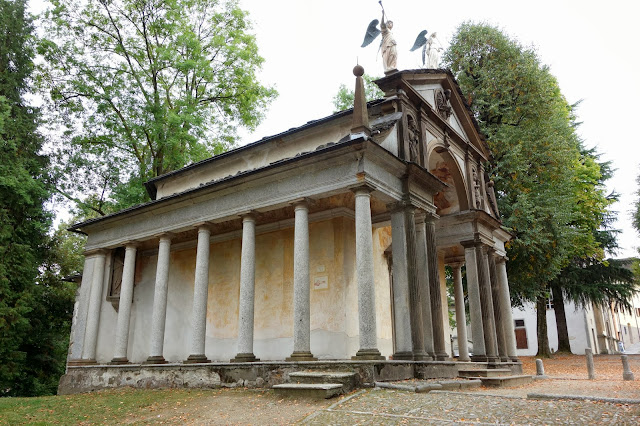 Demonstrating the continuity of the endeavor, the earliest chapels are in Renaissance style. As time passed, the succeeding building style changed to the theatrical Baroque, then Rocco, and finally Neo-classical in the last quarter of the 18th Century. Taken together they present a harmonious arrangement with the greensward, trees and vistas of the lake with its little island combining to encourage contemplation whether you are religious or not.