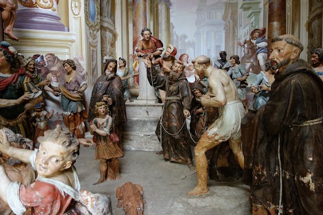 Each is filled with life-sized but dusty terracotta figures depicting scenes from the life of Saint Francis.