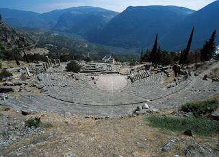 One of the most memorable days I ever spent immersed in the ancient world was a visit to Delphi, dedicated to Apollo and home of the Delphic Oracle, called Pythia, by tradition a local woman over age 50. The area was a center of worship before the first millennium BC and was still in operation in 385 AD when Emperor Theodosius abolished it. The site, not far from Athens, retains an aura of mystery because of the beauty of its surroundings and the evocative ruins of temples in the Sacred Precinct. This most famous shrine to Apollo rests on Mount Parnassus’ steep slopes. The location was considered to be the center of the earth and was therefore sacred to the god as well as home to the muses, personifications of poetry, music and learning.