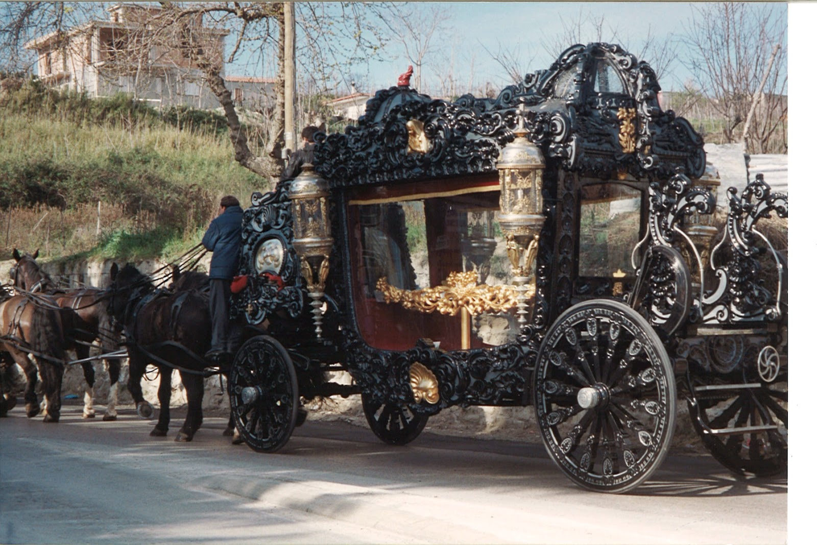 When we emerged into the brilliance after one visit we were suddenly transported to a relic of the 18th century. A funeral cortege was passing by. In the lead was an enormous ornately carved Baroque black wooden coach drawn by six black horses with black plumes on their bridles. The coach was glass sided with two gold and silver lanterns, each at least six feet tall, a gold railing across the glass and a gold cockle shell adorning each of the lower sides. The wheel spokes were as elaborately carved as the coach body. On top were two screened domes to dispel the odor of decay. A coffin heaped with flowers rested on a red velvet bier inside the coach. Incongruously, the driver and his helper sitting on the carved and painted high seat were wearing ordinary slacks and windbreakers. No bewigged footman in sight. A dozen cars followed the coach as it slowly made its way along the road. The cars were hung with funeral wreaths so big that they were nearly buried in flowers. Were they headed to the cemetery or to Lake Avernus and the underworld to see the deceased off on his journey to an unknown destiny?
