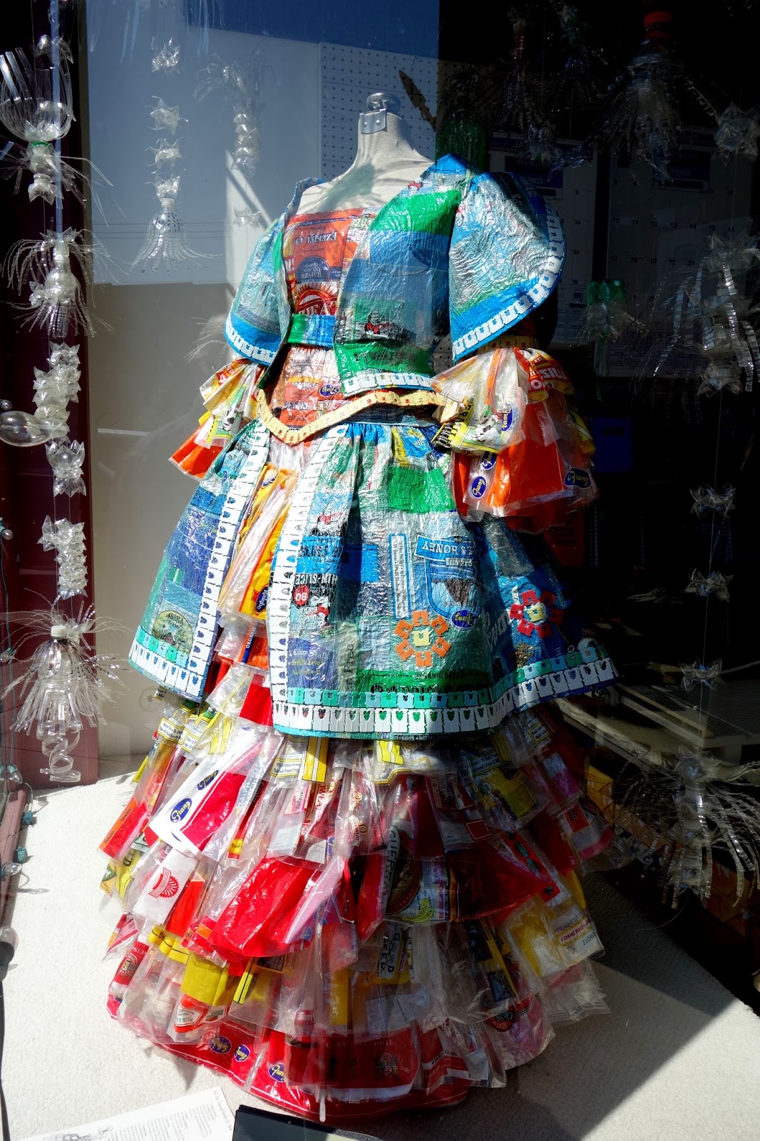 This window shows an entry into a wearable art competition – a winner as far as I was concerned. I especially like the bread wrapper and closures used as decoration around the over skirt and sleeves: