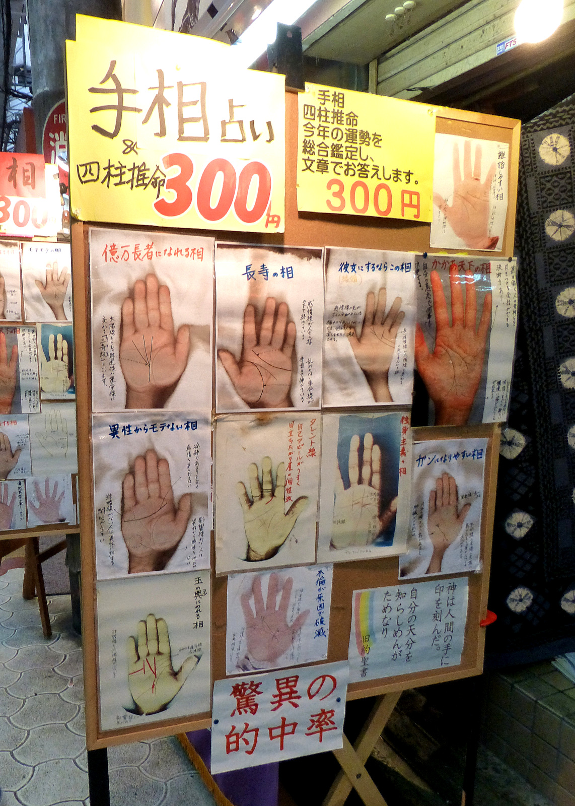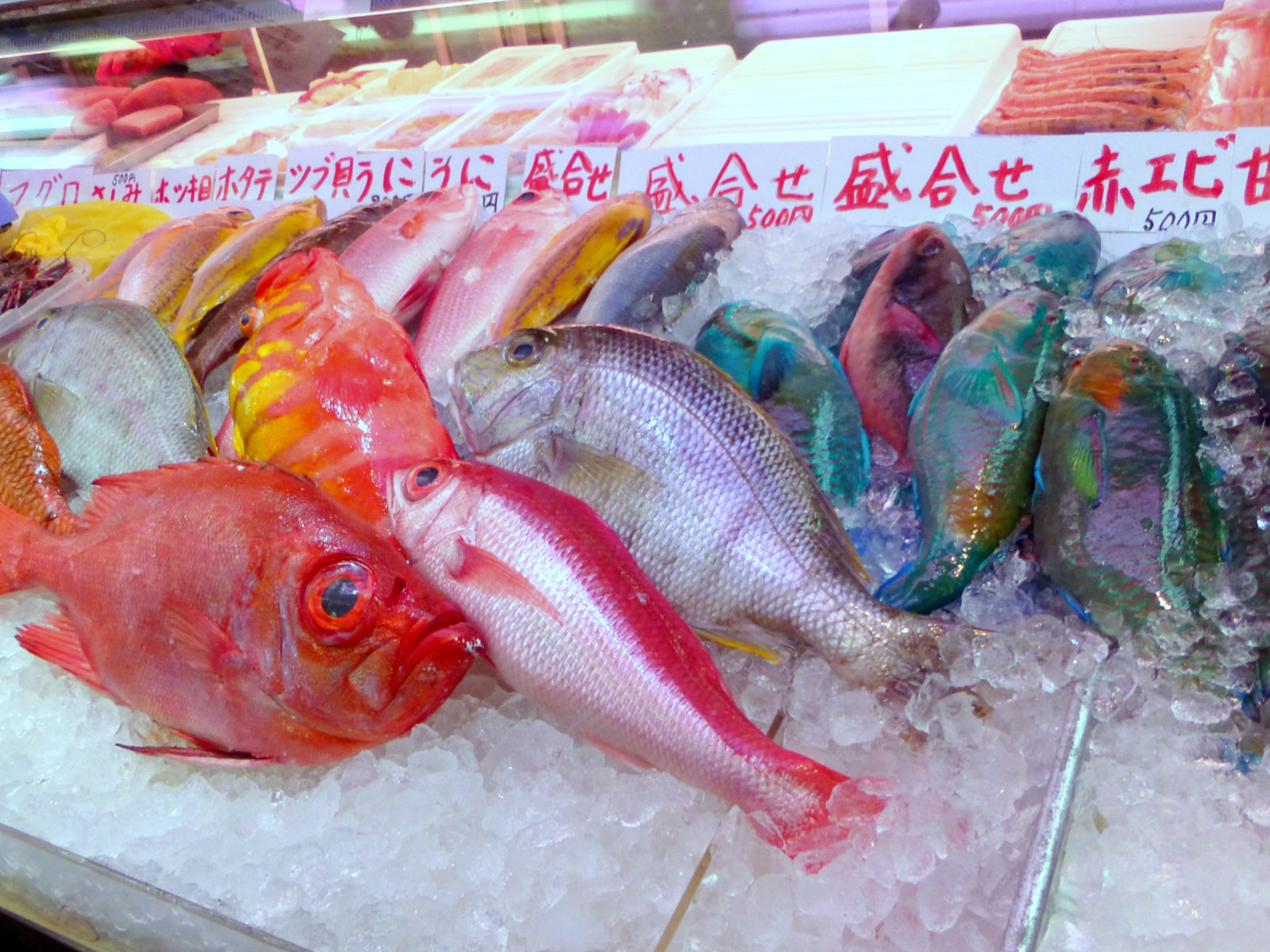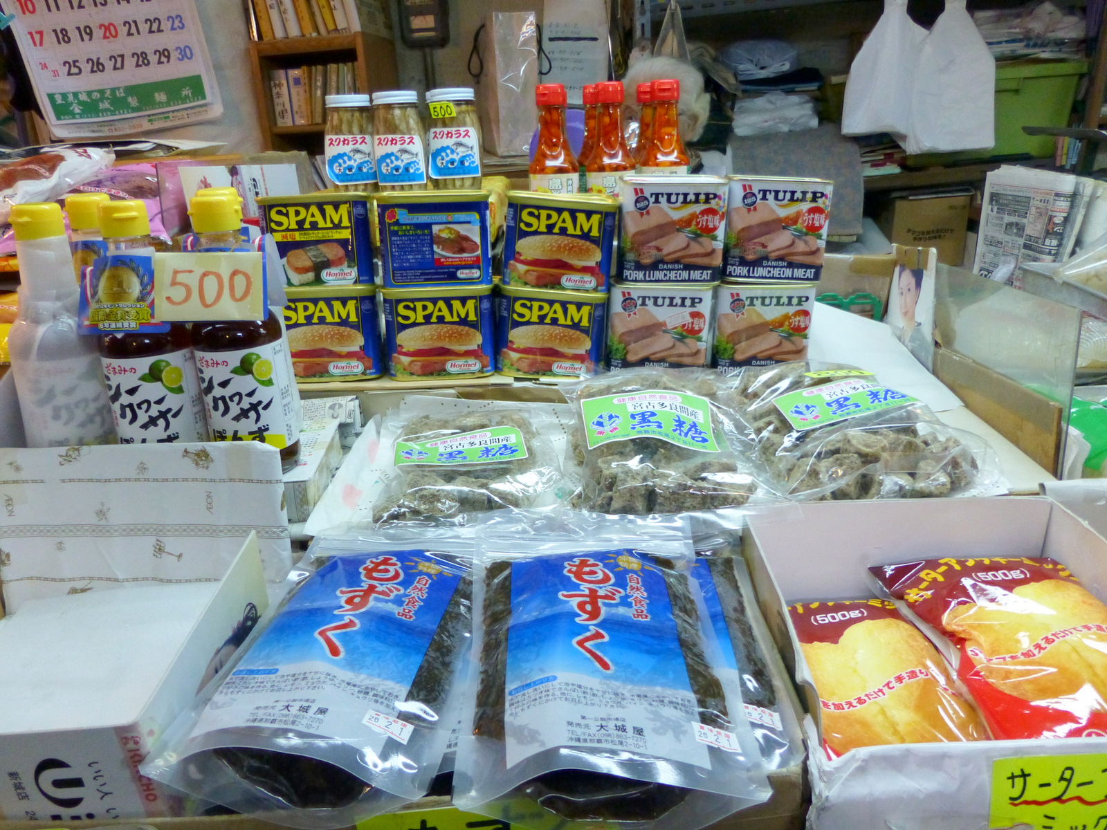 Should I buy some of the strong Awamori liquor made with long-grain rice and a black mold? Or have my palm read – it was cheap, only 300 yen? But I was too doubtful about the drink and can’t understand Japanese so I passed into the food market, a cornucopia of unfamiliar seafood and produce (except for the stacks of SPAM labeled in Japanese).