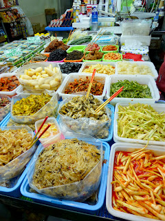 The fish displays looked like rainbows as they rested on ice near prawns ready for Sunday dinner. Different than the steel-gray fish from my familiar cold North Pacific waters, they were so beautiful they belonged in an aquarium rather than a pot on the stove or on a grill. Large tanks held bright-red lobster and crab; prawns rested on ice near the fish; containers of small dried fish along with other pickled and dried unknown items filled several stalls. The meat counters were showing various cuts of pork, the most common meat eaten on the island. One whole shop was devoted to what looked like hard brown bananas. When I asked what they were the vendor held one up and grated flakes into a bowl. She said they were flakes of bonito tuna compressed into a size and shape easy to hold when preparing them as seasoning for a bowl of noodles and broth.