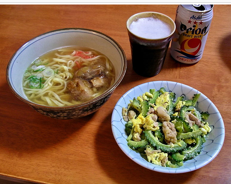 By this time it was clear that all this food made me hungry. It was time for a Sunday feast. Now where was that restaurant with the music? The one with Orion beer, bowls of soba noodles and champuru – bitter gourd stir-fried with pork and egg. Yes!