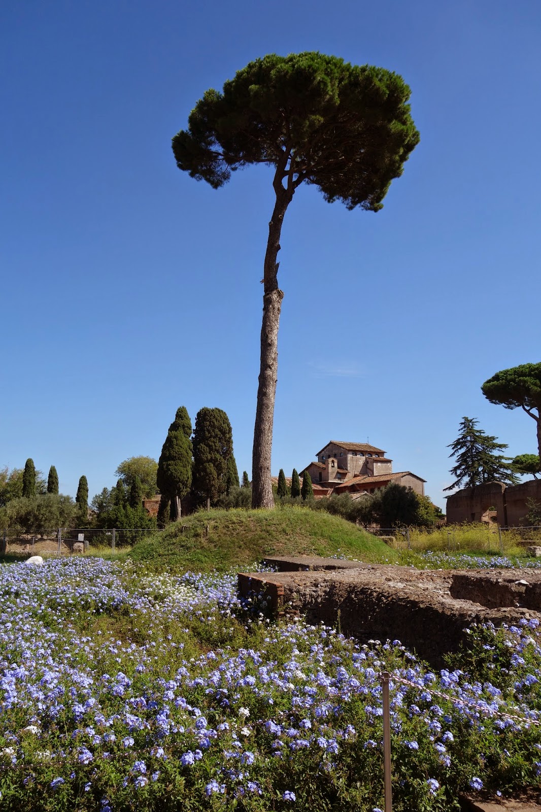 The sky is a brilliant blue and the umbrella pines are a deep and dark green.