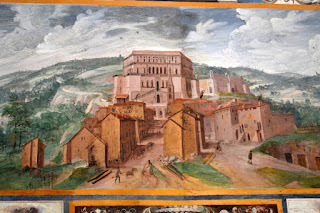 We headed north  through the usual depressing detritus of suburbia, shopping malls and outlet stores until we reached the real countryside set with groves of filbert and olive trees along with a few vineyards. Turning this way and that we came to the small town of Caprarola, the site of the magnificent Villa Farnese built for Cardinal Alessandro Farnese between 1559 to 1575. The sun suddenly appeared to highlight a pentagon-shaped building rising five stories above a long flight of terraced steps set at the top on a hill dominating the town.